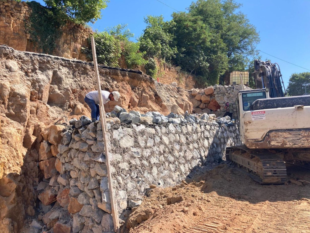 100 metre uzunluğunda 11 metre yüksekliğinde yapılan taş duvarda çalışmalar devam ediyor. 45. metresinde çalışan ekipler çalışmaları kısa sürede tamamlayarak vatandaşlara güvenli bir güzergâh sunmuş olacak.