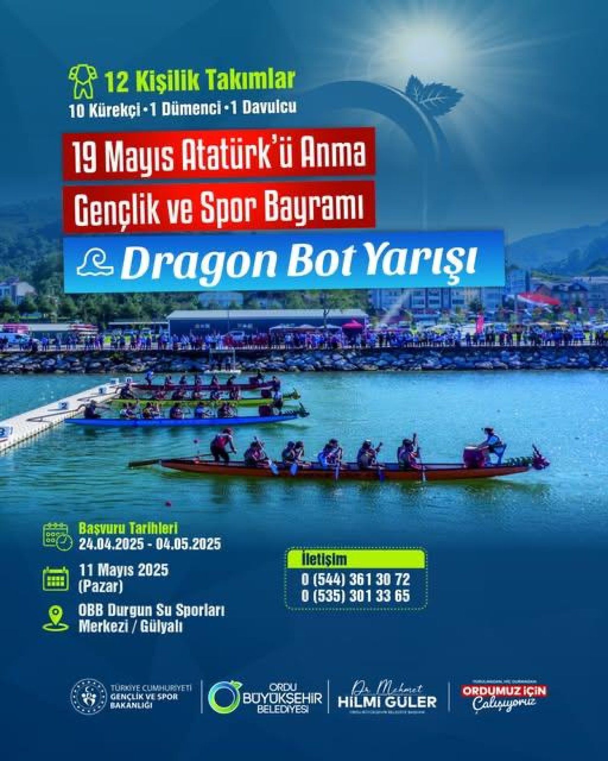 Ordu Büyükşehir Belediyesi Kültür, Turizm ve Sanat Dairesi Başkanlığı Gençlik, Spor ve Sağlıklı Yaşam Şube Müdürlüğü ile Gençlik ve Spor İl Müdürlüğü tarafından düzenlenecek olan Dragon Bot Yarışları için kayıtlar başladı. Gülyalı ilçesi Durgun Su Sporları Merkezi’nde düzenlenecek olan yarışmalara kayıtlar gssm@ordu.bel.tr adresinden yapılacak. 12 kişiden oluşan takımlarda 10 kürekçi 1 dümenci ve 1 davulcu yer alacak. Dragon Bot Yarışlarına katılacak olan takımların 24 Nisan-4 Mayıs tarihleri arasında Dragon Bot Yarışları başvuru formunu doldurarak gssm@ordu.bel.tr adresine son başvuru tarihine kadar mail atmaları gerekmektedir.
